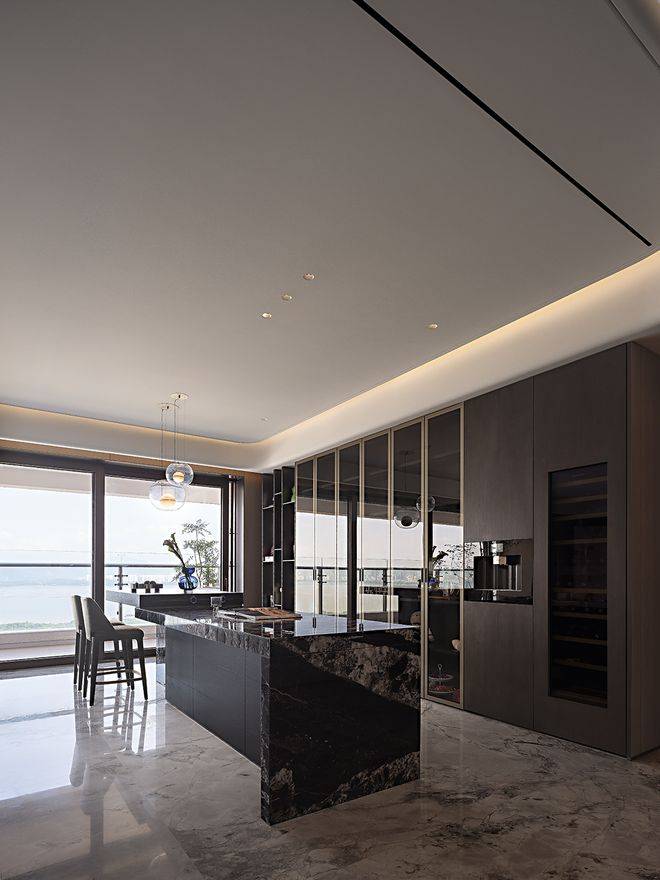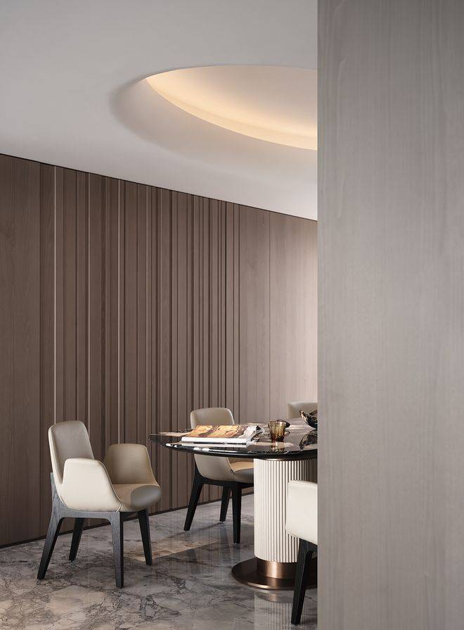 真正的奢侈,在于那些需要细看才能发现的用心。墙面木饰面采用上下异纹设计,嵌入纤细金属线条,于微妙起伏中塑造立体层次。