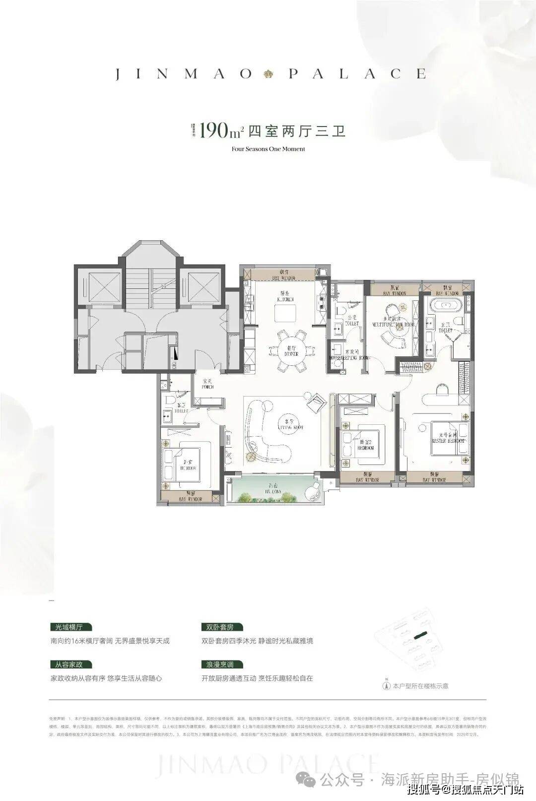 ● 建面约190㎡4房:楼王位置的顶奢大平层,同价位段在杨浦只能买到约120㎡3房!